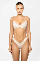 Venus Top Vanilla, Classic Supportive Bikini Top. Meet Venus, your effortless go-to bikini top for every occasion. Designed with a flattering front coverage that supports small to medium busts, it offers a naturally lifted, secure fit. The slim shoulder straps keep the look clean, minimal, and easy to pair with any of our bikini bottoms.