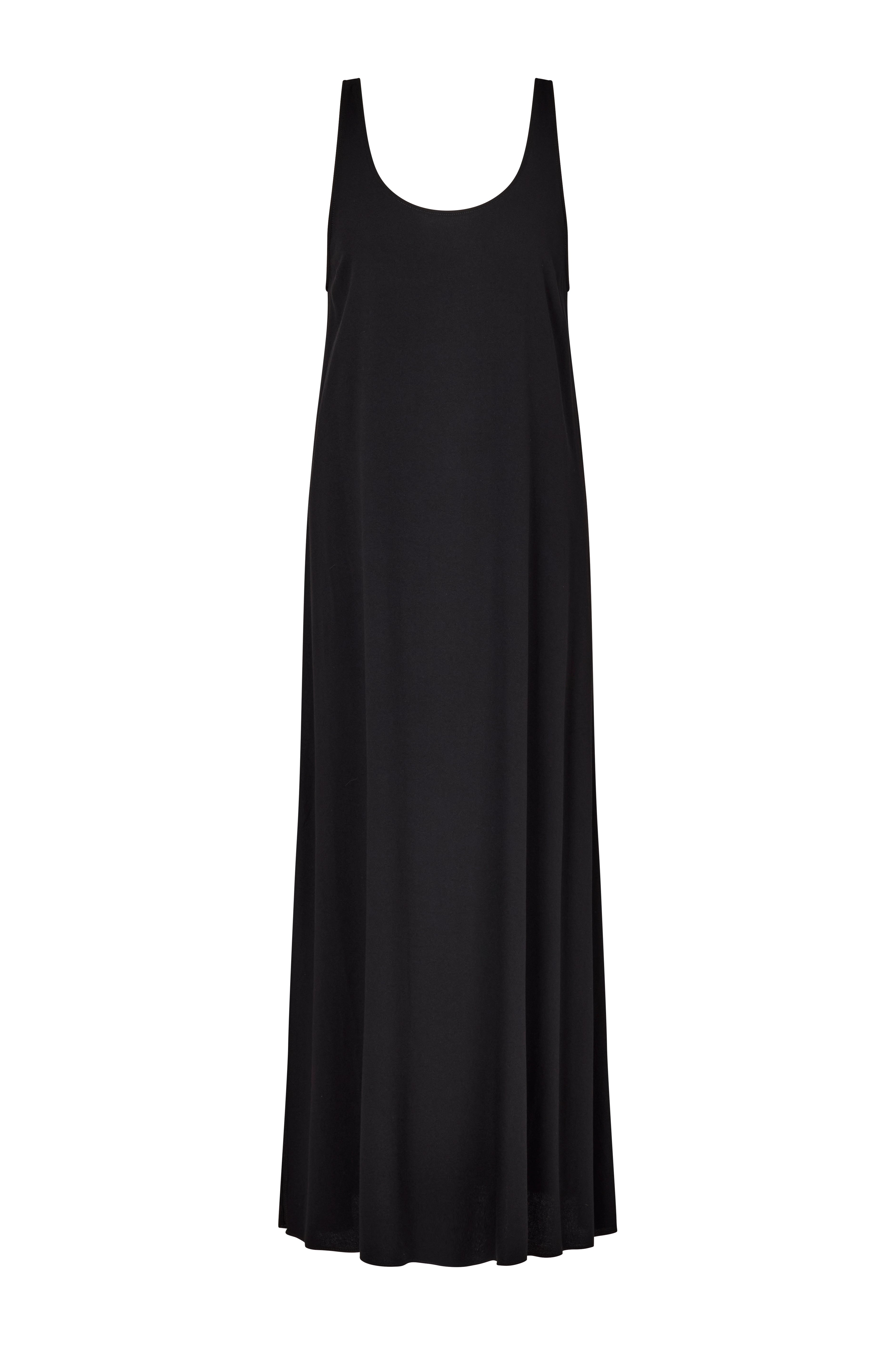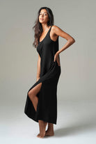 The Cloud Slip in Black, effortless resort elegance. Crafted in 100% lightweight rayon, this long flowing slip dress moves softly with every step. Designed with a deep U-shaped back and side slit for natural movement, it’s the perfect balance of ease and elegance. Feather-light, breathable, and endlessly versatile – wear it over swimwear by day or style it with gold jewelry for sunset dinner