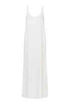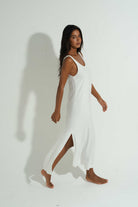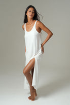 The Cloud Slip in Milk, effortless resort elegance. Crafted in 100% lightweight rayon, this long flowing slip dress moves softly with every step. Designed with a deep U-shaped back and side slit for natural movement, it’s the perfect balance of ease and elegance. Feather-light, breathable, and endlessly versatile – wear it over swimwear by day or style it with gold jewelry for sunset dinner