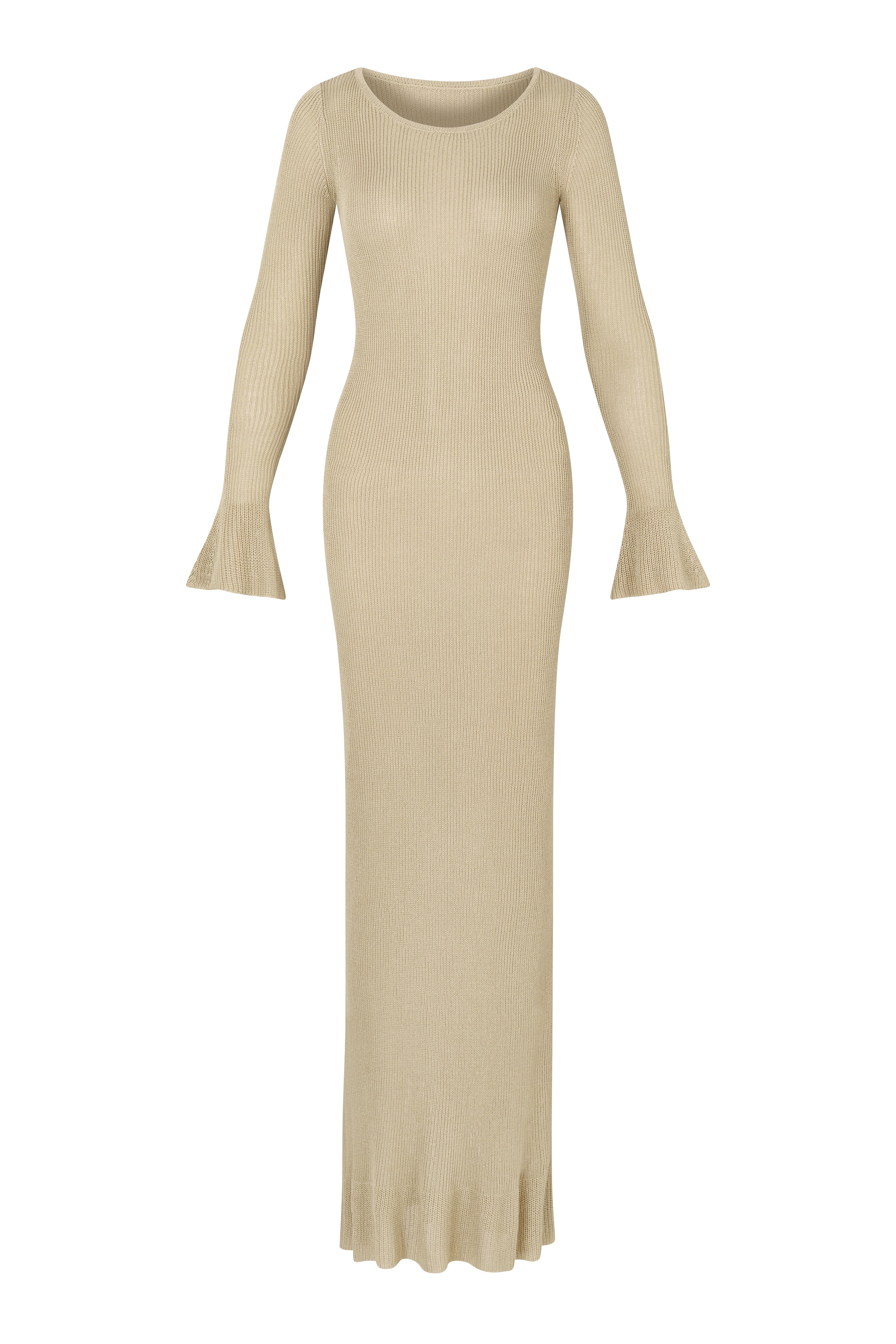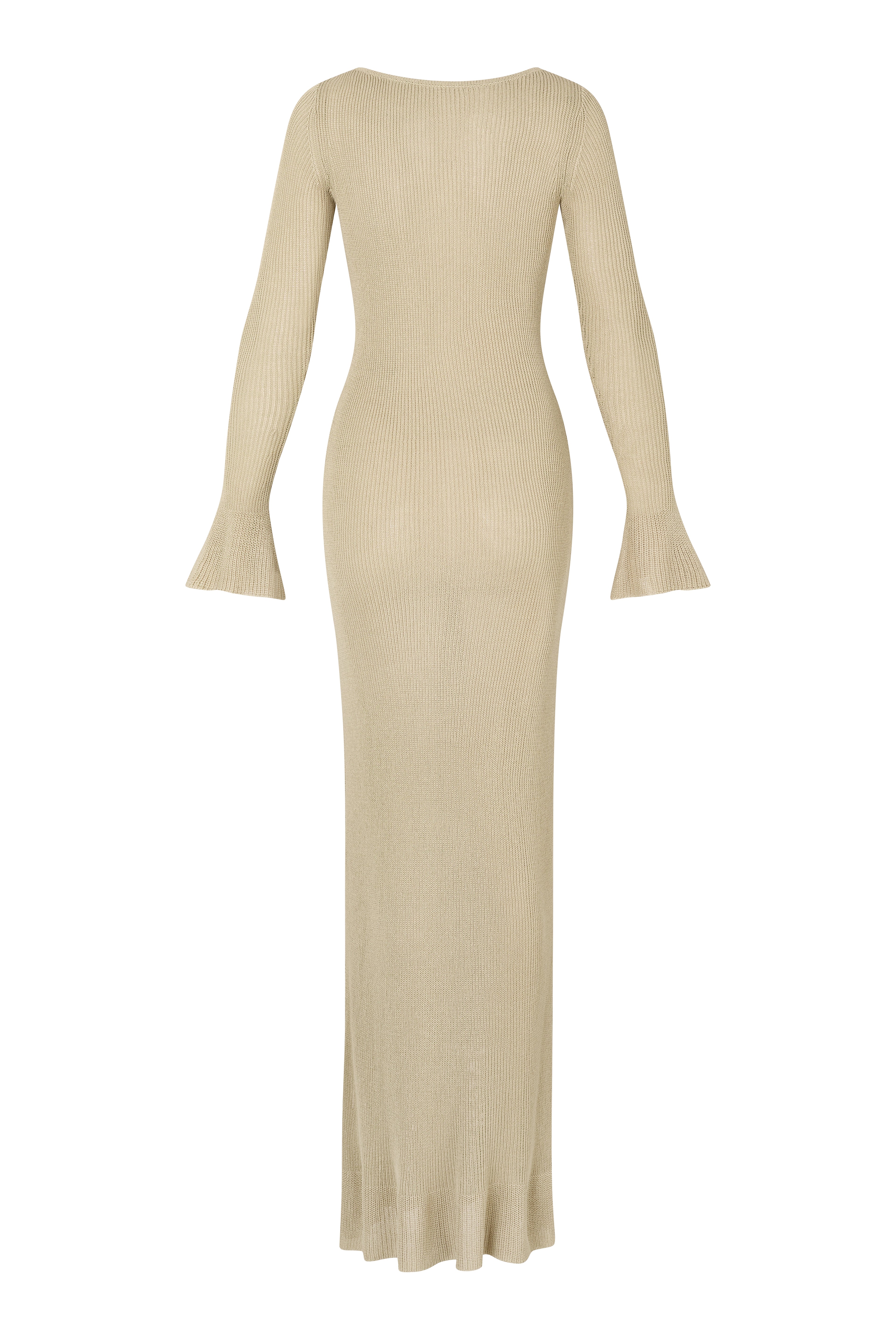 The Muse Dress in Beige, soft, elegant, and effortlessly refined. Crafted in a delicate knit with a smooth, flowing drape, The Muse moves beautifully along the body with peplum sleeves and a floor-grazing length. Designed to move gracefully with you, it’s your timeless go-to for coastal nights and city escapes. Feminine, fluid, and made to be cared for, hand wash only.